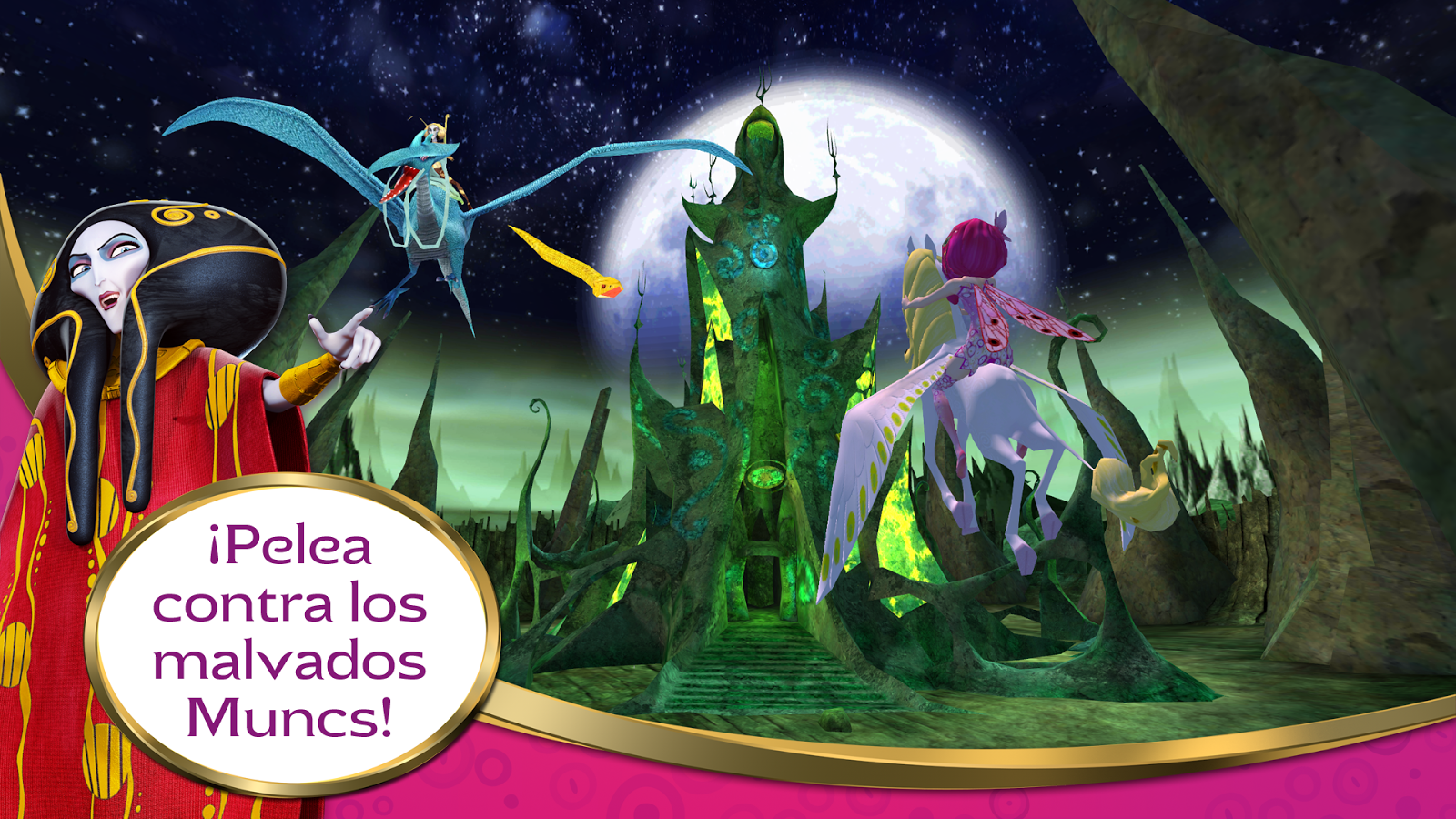 ¡Cabalga y vuela a través de hermosos paisajes! ¡Decubre las sendas ocultas! ¡Conoce nuevos amigos, salva a todos los unicornios y al Principe Mo de la malvada Gargona y su ejercito de Muncs!
