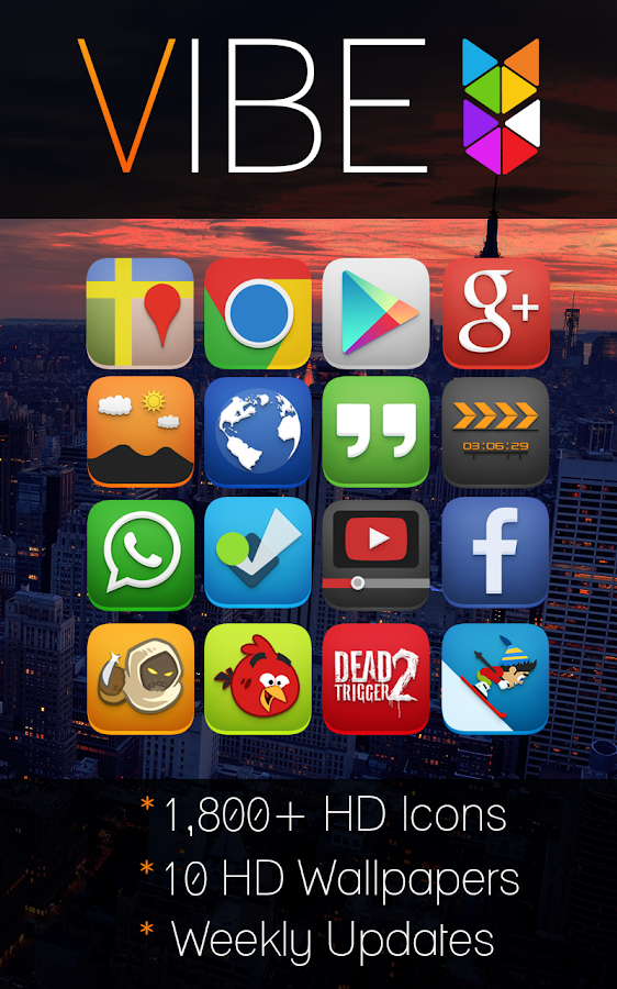 Bellamente iconos nítidos con un énfasis en la perspectiva. Cada icono de Vibe está diseñado para hacer estallar su dispositivo con sombreado y degradados de color detalladas. Los fondos de pantalla que se incluyen son brillantes y coloridas, pero no demasiado para asegurar los iconos se destacan en su dispositivo. Si estás aburrido de diseño plano, Vibe es el tema perfecto para ayudar a tu pantalla de inicio pop con dimensión de nuevo!