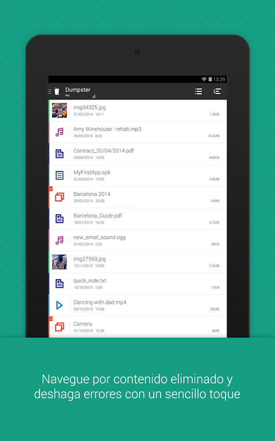 ✔ Restaura imágenes, archivos de música, videos y cualquier tipo de archivo (pdf, mp3, doc, avi, mp4, jpg, png, rar, ogg, txt y muchos más: http://dumpsterapp.mobi/support.html#file-types)