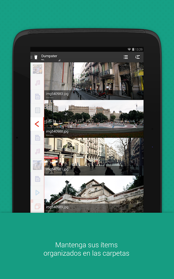 ✔ Envía archivos a Dumpster utilizando la opción de "compartir" o "enviar a" desde cualquier administrador de archivos o aplicación de imágenes.